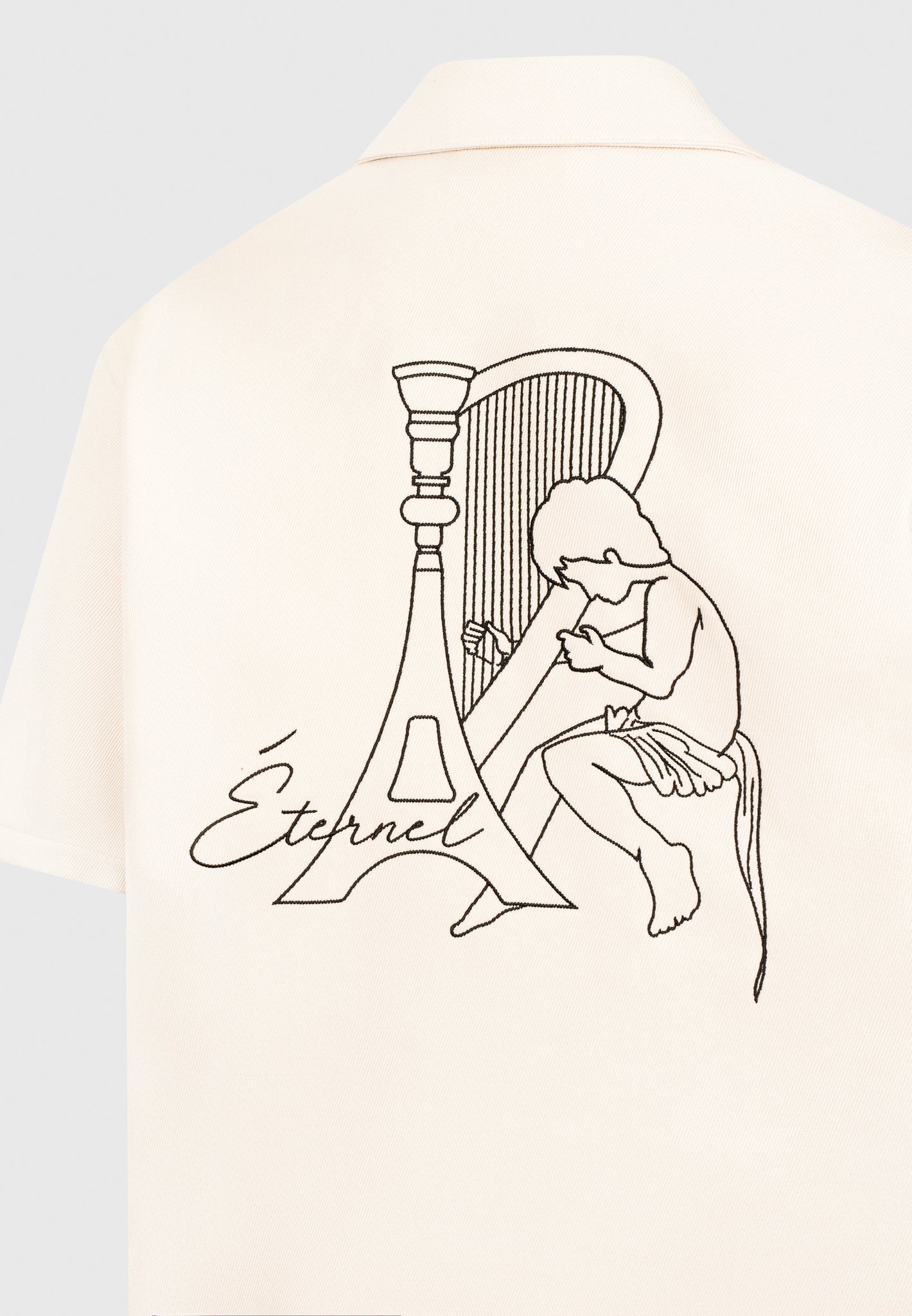 Crafted with a textured fabric, the Etérnel Embroidered Eiffel Twill Shirt embodies a perfect fusion of style and comfort. Its wide front pockets, intricate embroidered details, and refined revere collar elevate its allure, while the short sleeve silhouette and boxy fit offer a relaxed yet polished look.